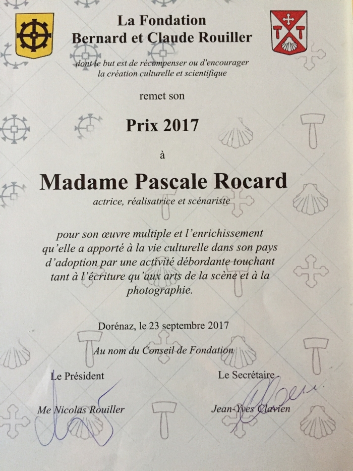 La Fondation Bernard et Claude Rouiller, dont le but est de récompenser ou d'encourager la création culturelle et scientifique, m'a remis son prix en 2017, "pour son œuvre multiple et l'enrichissement qu'elle a apporté à la vie culturelle dans son pays d'adoption par une activité débordante touchant tant à l'écriture qu'aux arts de la scène et à la photographie."