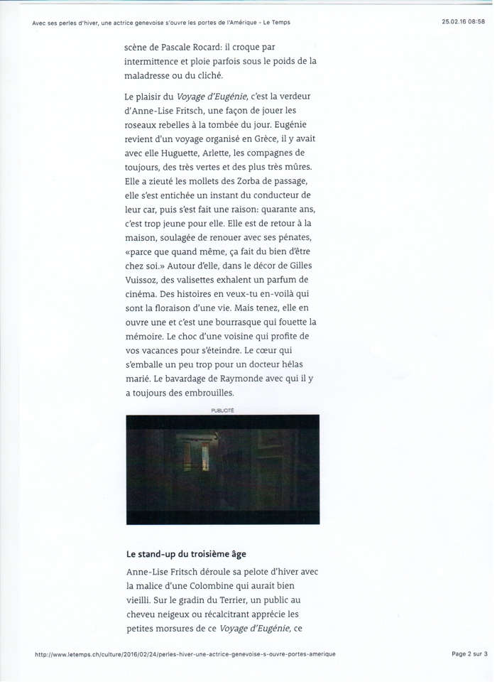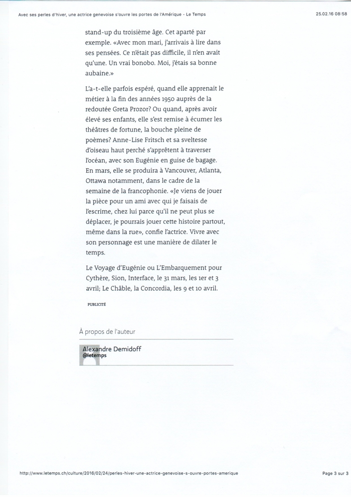Article: 2016-Février- Le Voyage d'Eugènie pour le Journal le TEMPS
